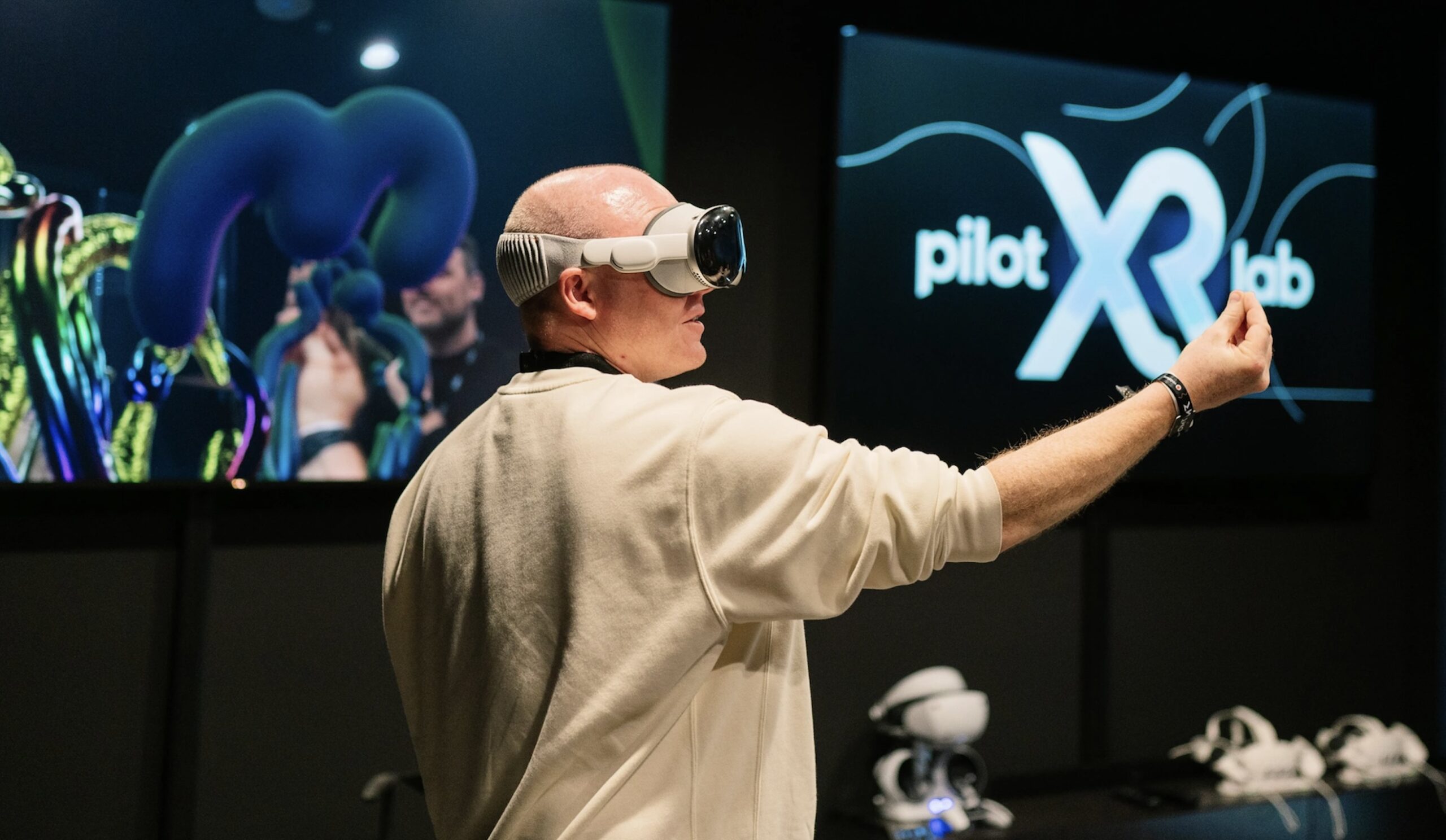 Im Anschluss an unsere Bühnengespräche waren unsere Gäste dazu eingeladen, die vorgestellten Tools und Erlebnisse selbst auszuprobieren. An verschiedenen Stationen und in unserem von pilot und der pilot Screentime gestaltetem XRlab konnten die Teilnehmenden das Potential von Mixed Reality hautnah erleben und sich direkt mit unseren Speaker*innen und Expert*innen dazu austauschen.